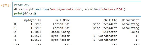 ## Jupyter Notebook import pandas as pd df_csv = pd.read_csv('employee_data.csv', encoding='windows-1254') print(df_csv) ## Result is as below