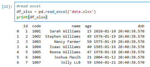 ## Jupyter Notebook import pandas as pd df_xlsx = pd.read_excel('data.xlsx') print(df_xlsx) ## Result is as below