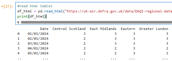 ## Jupyter Notebook import pandas as pd df_html = pd.read_html("https://uk-air.defra.gov.uk/data/DAQI-regional-data?regionIds%5B%5D=999&aggRegionId%5B%5D=999&datePreset=6&startDay=01&startMonth=01&startYear=2022&endDay=01&endMonth=01&endYear=2023&queryId=&action=step2&go=Next+")[0] print(df_html) ## Result is as below