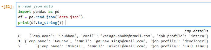 ## Jupyter Notebook import pandas as pd df_json = pd.read_json("data.json") print(df_json) ## Result is as below