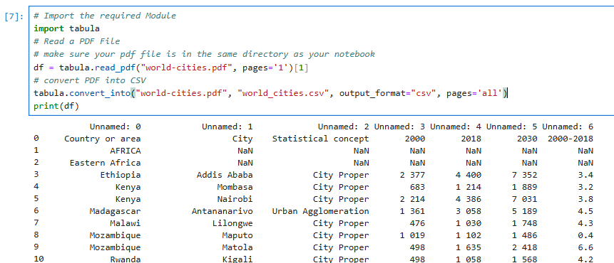 ## Jupyter Notebook # Import the required Tabula Module import tabula # Read a PDF File # make sure your pdf file is in the same directory as your notebook df = tabula.read_pdf("world-cities.pdf", pages='1')[1] # convert PDF into CSV tabula.convert_into("world-cities.pdf", "world_cities.csv", output_format="csv", pages='all') print(df) ## Result is as below